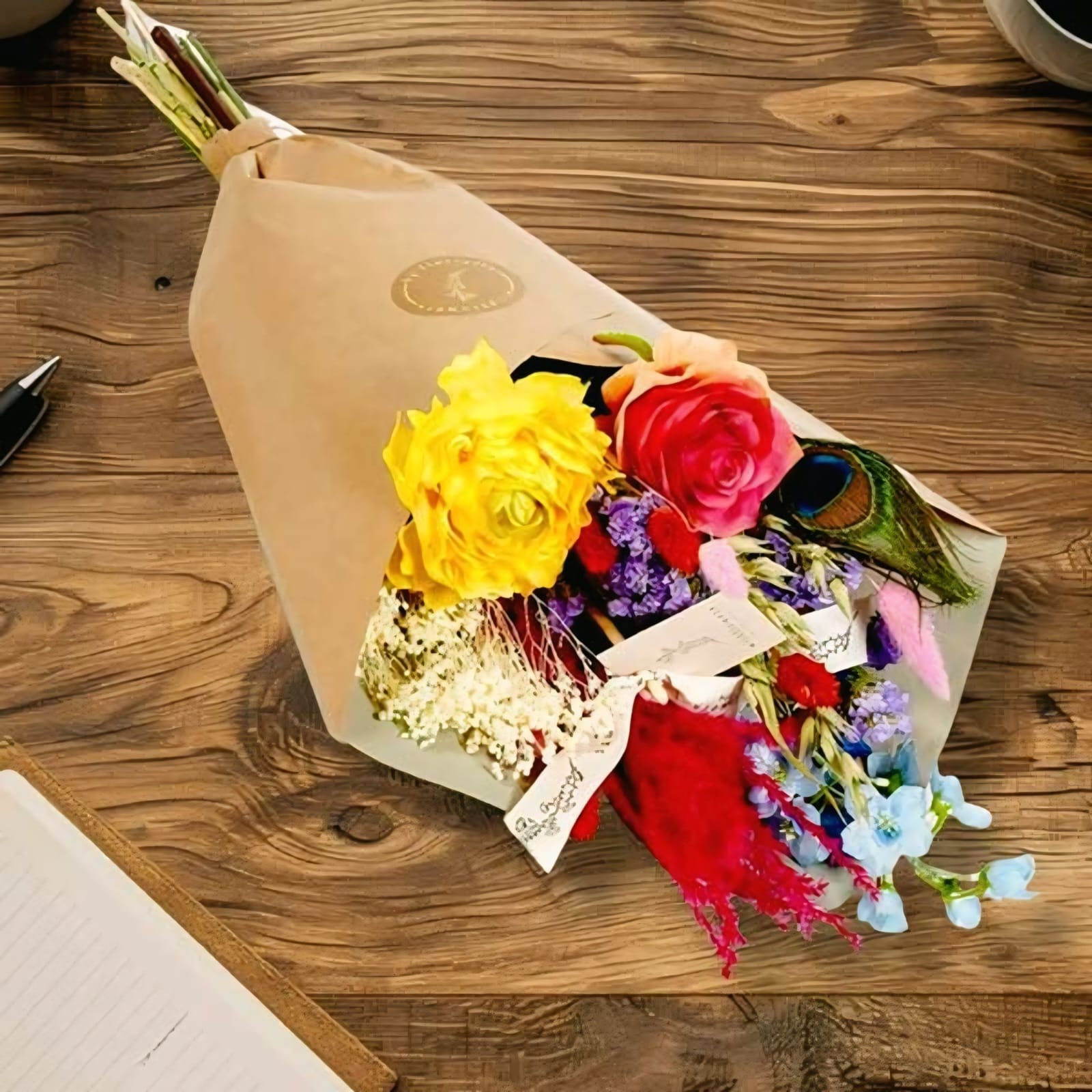 - Deze prachtige combinatie van gedroogde en zijden bloemen biedt een kleurrijk en natuurlijk uiterlijk. De bloemen zijn beschikbaar in diverse tinten zoals roze, wit en geel, terwijl de bladeren een weelderig groen zijn. De bloemen zijn zorgvuldig gerangschikt, waardoor ze een volle en levendige uitstraling hebben.