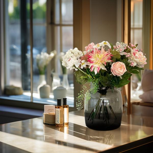 🌸 Boeket M – Pastel Lover is een elegant kunstbloemenboeket in zachte tinten die rust en verfijning uitstralen. Met een hoogte van 40 cm is dit compacte boeket perfect voor kleine vazen, nachtkastjes, dressoirs of als charmant detail op tafel. De combinatie van zijden bloemen in pastelroze, zachtgeel, crème en lavendel zorgt voor een romantische en frisse uitstraling in elk interieur.